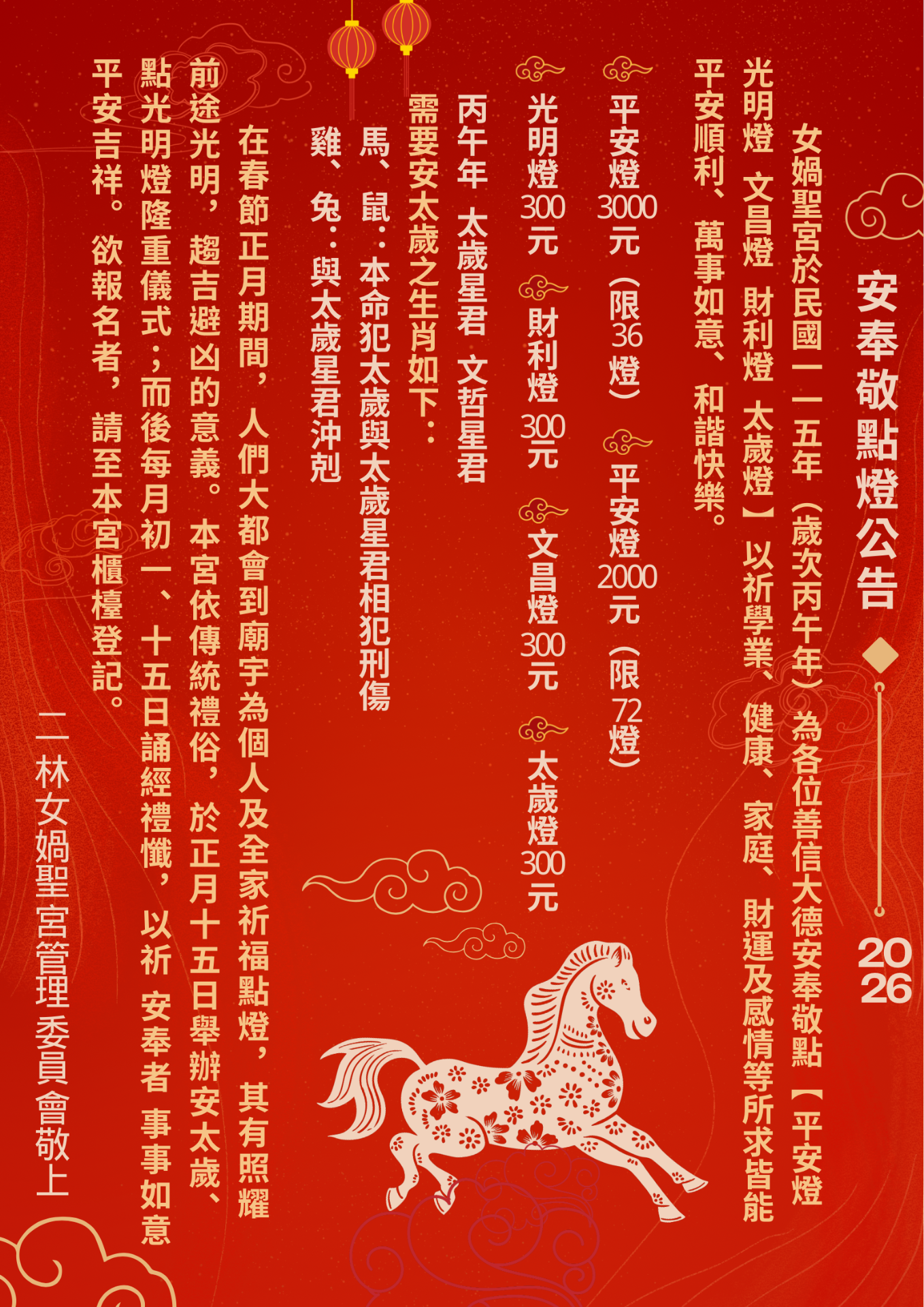 2026-01-01 【臘月十三】新年快樂!農曆歲次丙午年肖馬,犯太歲生肖:正沖~馬、鼠;偏沖~雞、兔。即日起至農曆正月十五前,開始祈點平安燈、光明燈、文昌燈、財利燈及安太歲登記。